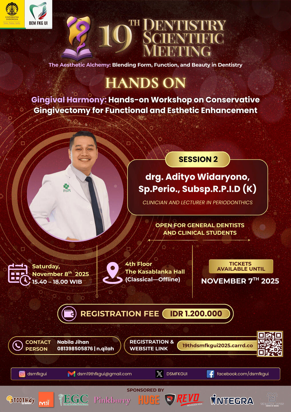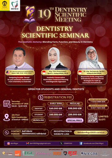 The Dentistry Scientific Meeting (DSM) at the Faculty of Dentistry, Universitas Indonesia, is an annual event designed to advance dental knowledge and technology. Featuring scientific seminars, competitions, and hands-on activities, DSM introduces the latest advancements in dentistry to address global oral health challenges. Emphasizing continuous learning, DSM ensures that dental professionals and students remain updated with cutting-edge developments, enabling them to deliver high-quality oral health care in an evolving field.